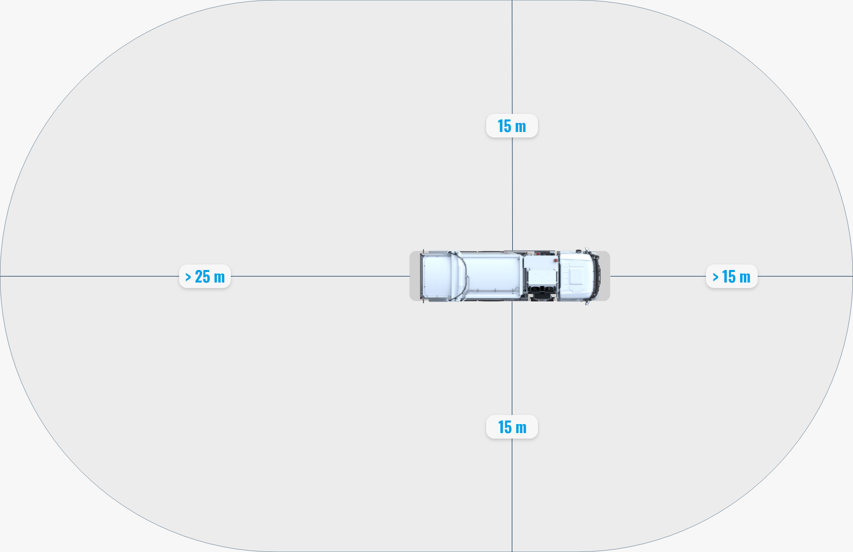 Der Fahrer hat eine Run­dum-Ein­sicht bis zu 15 Meter neben dem Fahrzeug — ohne dass er sich vom frontal­en Geschehen weg­drehen muss.